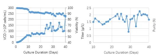 CHO细胞(表达单抗)40天灌流培养的细胞生产及活率